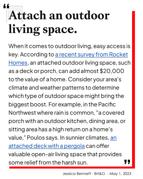 Better Homes & Gardens and Rocket Homes say outdoor living spaces can add substantial value to your home. (Read the full articles here and here.)